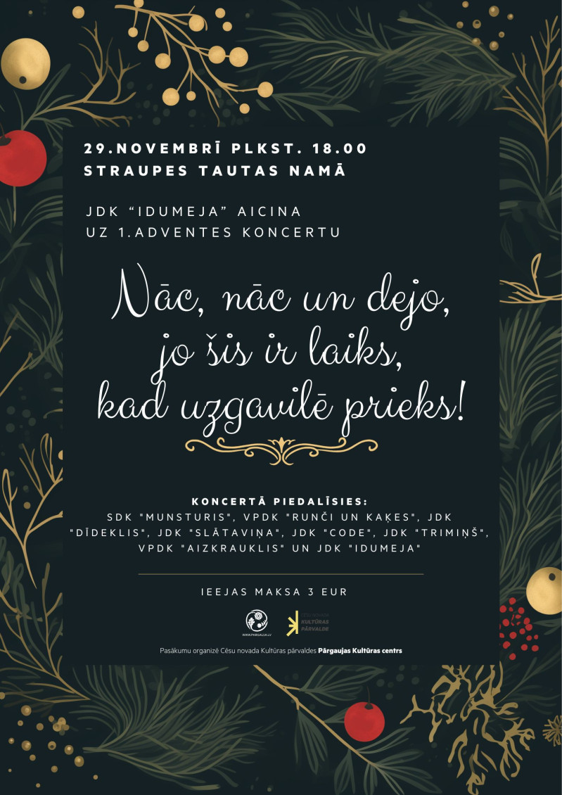JDK “Idumeja” aicina uz pirmās adventes koncertu "Nāc, nāc un dejo, jo šis ir laiks, kad uzgavilē prieks!" 29. novembrī plkst. 18.00 Straupes Tautas namā!