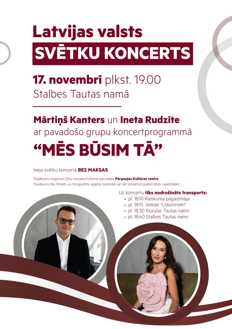 Dienā pirms Latvijas Republikas proklamēšanas 107. gadadienas, 17. novembrī, plkst. 19.00 Stalbes Tautas namu pieskandinās Mārtiņš Kanters un Ineta Rudzīte ar pavadošo grupu koncertprogrammā “MĒS BŪSIM TĀ”!