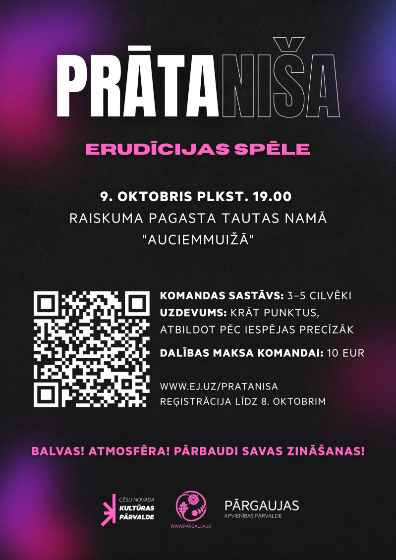 9. oktobrī plkst. 19.00 Raiskuma pagasta Tautas namā “Auciemmuiža” visi gudrie un zinātkārie aicināti uz erudīcijas spēles "Prāta niša" otro posmu!
