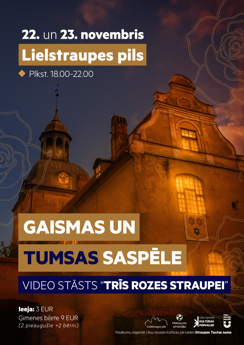Aicinām uz diviem īpašiem vakariem Lielstraupes pilī, kur gaisma un tumsa savīsies vienā elpu aizraujošā piedzīvojumā – 22. un 23. novembrī no plkst. 18.00 līdz plkst. 22.00.