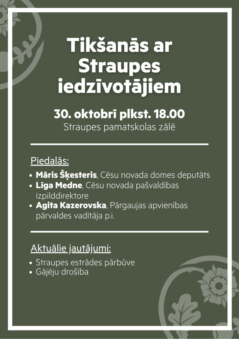 Cēsu novada pašvaldība aicina Straupes iedzīvotājus uz tikšanos, lai pārrunātu nozīmīgus jautājumus par ciema infrastruktūru un drošību.