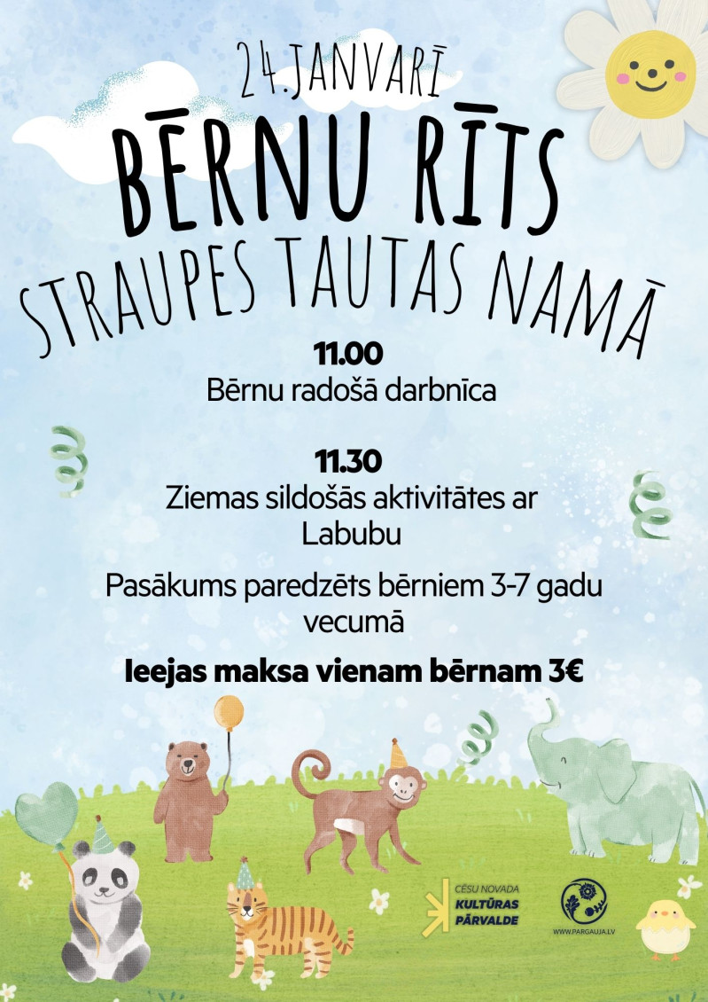 Šomēnes tiksimies 24. janvārī plkst. 11.00 Straupes Tautas namā, kur bērnus sagaida radošās darbnīcas un jautrs ziemas piedzīvojums kopā ar animatoru Labubu, dodoties sildošā un prieka pilnā ziemas ceļojumā.