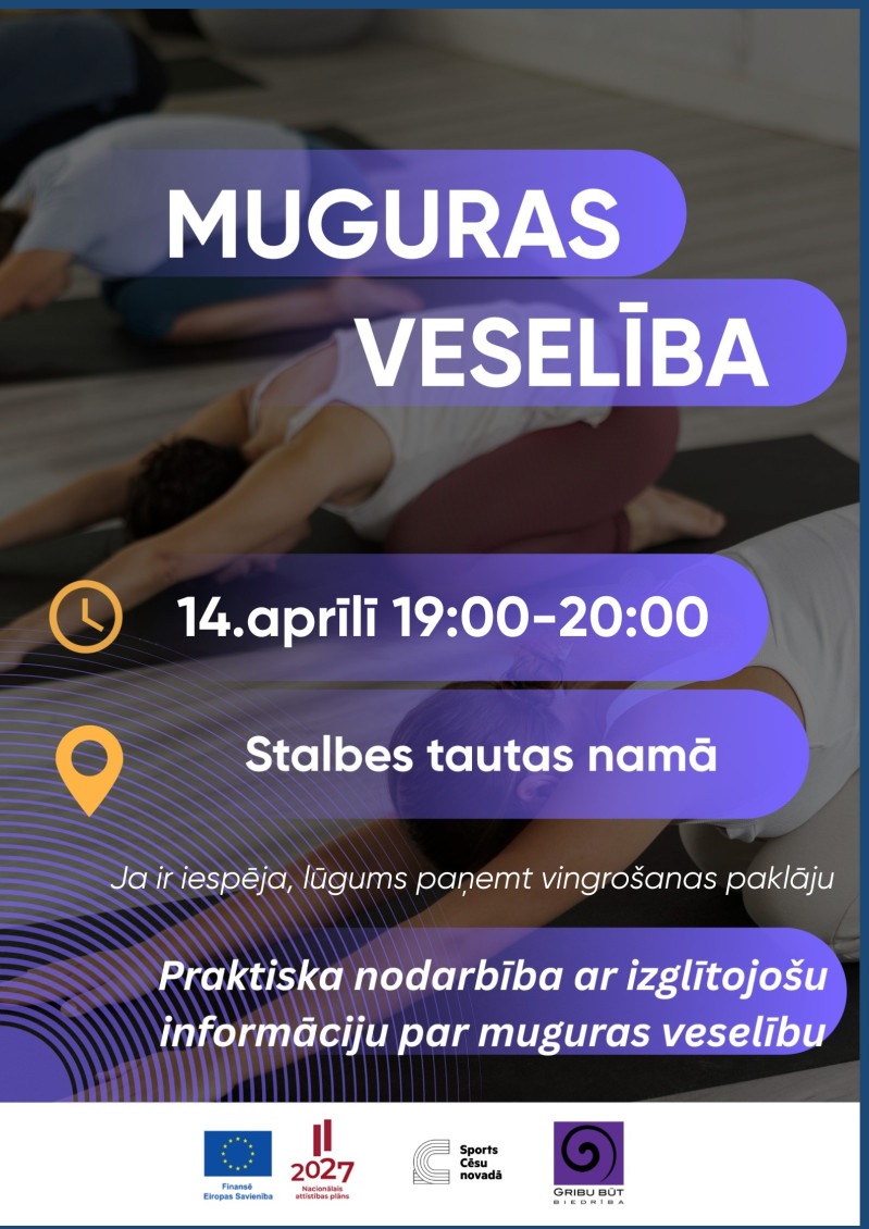 Otrdien, 14. aprīlī, plkst. 19.00 Stalbes Tautas namā biedrība “Gribu būt” sadarbībā ar Cēsu novada pašvaldību aicina uz bezmaksas nodarbību par muguras veselību.