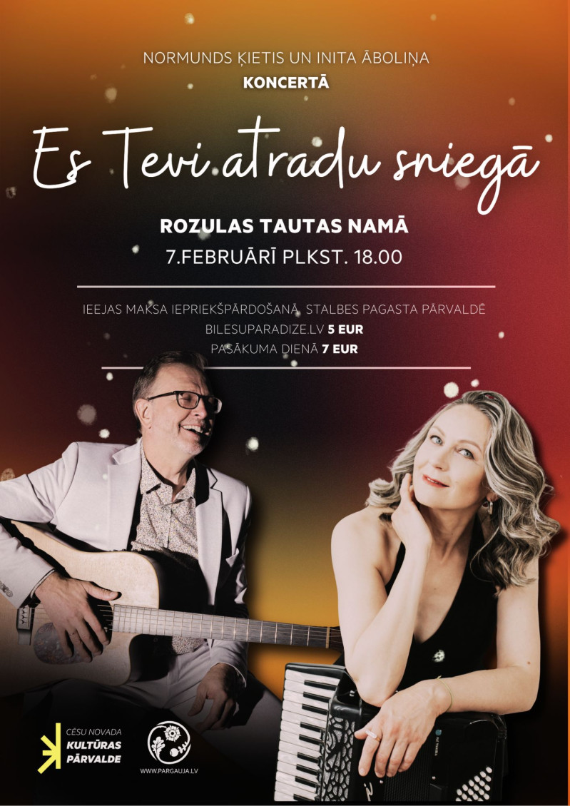 Sestdien, 7. februārī, plkst. 18.00 Rozulas Tautas namā uzstāsies Normunds Ķietis un Inita Āboliņa koncertā "Es Tevi atradu sniegā".