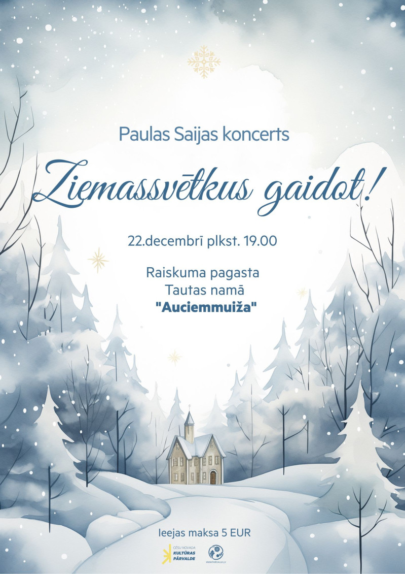 Aicinām uz sirsnīgu un muzikāli bagātu Ziemassvētku koncertu ar dziedātāju Paulu Saiju “Ziemassvētkus gaidot!”, kas notiks 22. decembrī plkst. 19.00 Raiskuma pagasta Tautas namā "Auciemmuiža".