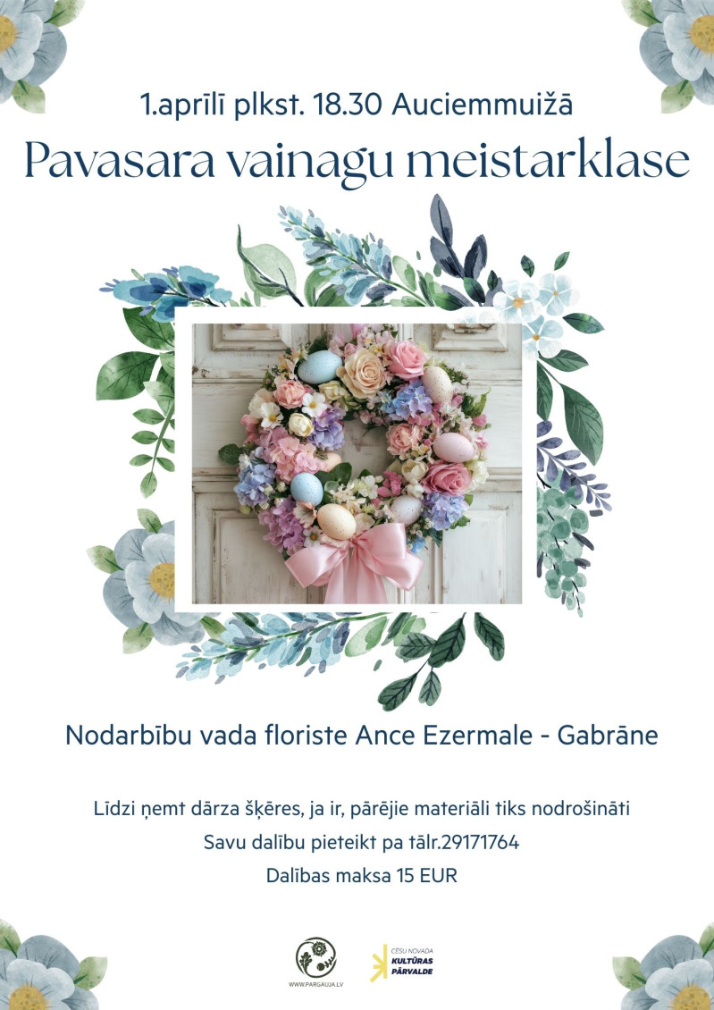 Trešdien, 1. aprīlī, plkst. 18.30 Raiskuma pagasta Tautas namā “Auciemmuiža” aicinām uz radošu un iedvesmojošu vakaru - pavasara durvju vainagu meistarklasi.