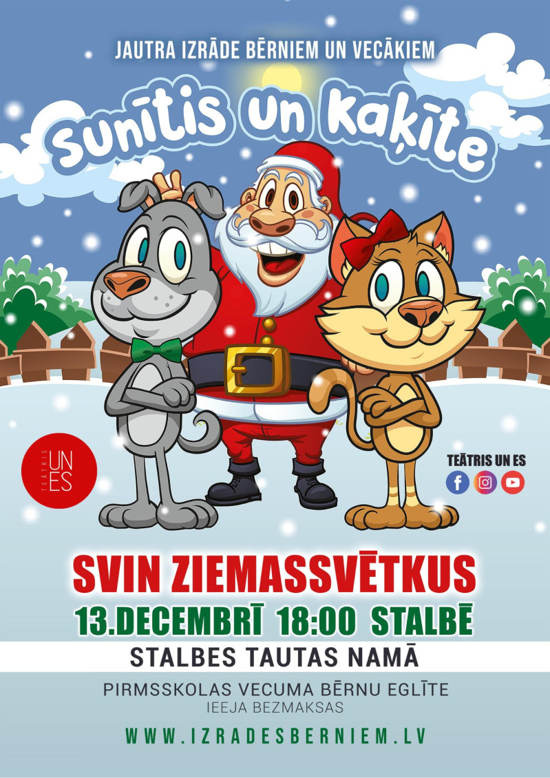 Visus pasākuma dalībniekus priecēs “Teātris un es” ar jautro izrādi “Sunītis un Kaķīte svin Ziemassvētkus”, kurā Sunītis un Kaķīte spēlēs dažādas spēles, sacentīsies un kopā ar bērniem sagaidīs Ziemassvētku vecīti.