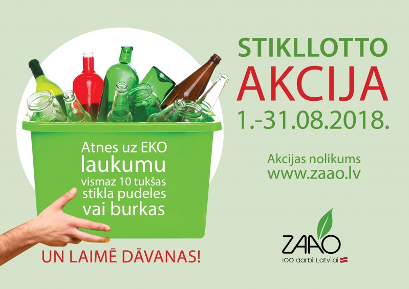 No 1. līdz 31.augustam notiks SIA “ZAAO” (ZAAO) organizēta izlietotā stikla iepakojuma vākšanas akcija “Stikllotto”, kuras laikā, nogādājot uz EKO laukumiem vismaz 10 tukšas stikla pudeles vai burkas, ir iespēja piedalīties balvu izlozē.