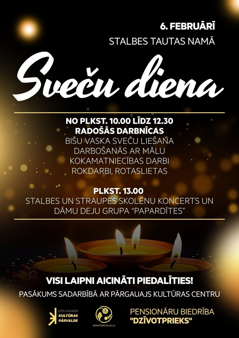 Pensionāru biedrība “Dzīvotprieks” aicina ikvienu uz Sveču dienas pasākumu, kas notiks 6. februārī Stalbes Tautas namā.