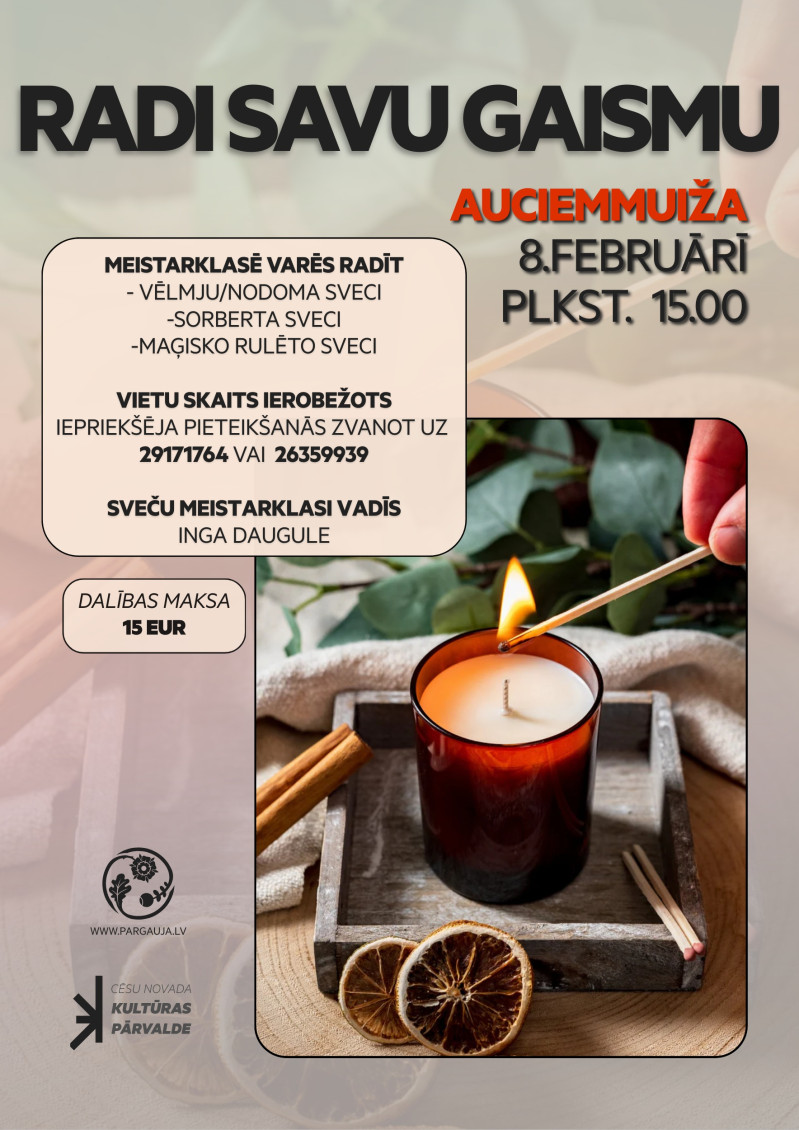 Aicinām piedalīties sveču liešanas meistarklasē 8. februārī plkst. 15.00 Raiskuma pagasta Tautas namā “Auciemmuiža”!
