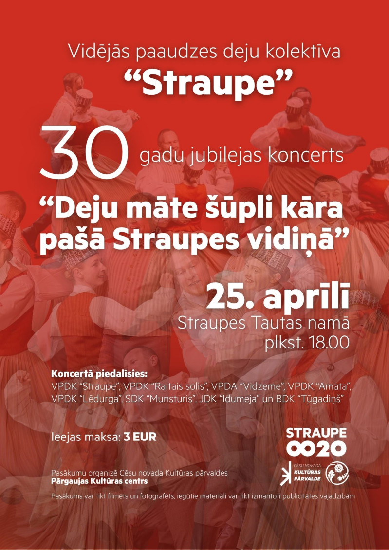 Sestdien, 25. aprīlī, plkst. 18.00 Straupes Tautas namā vidējās paaudzes deju kolektīvs “Straupe” aicina uz savas skaistās 30 gadu jubilejas koncertu “Deju māte šūpli kāra pašā Straupes vidiņā”!